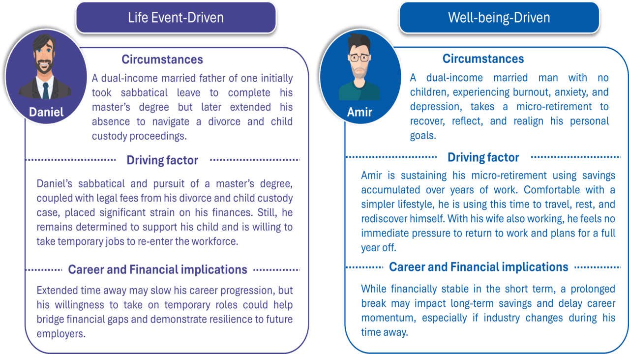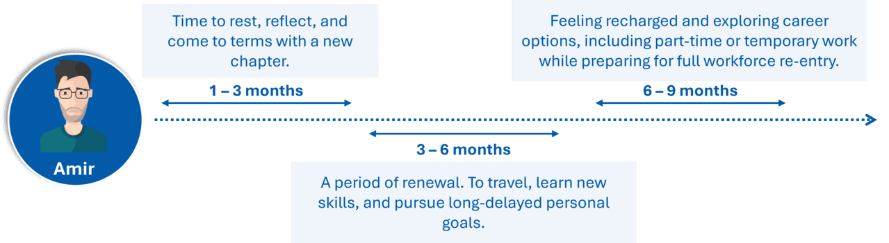 ICMR’s research shows that fear of not having enough becomes a key driver motivating Millennials and Gen Z towards more secure financial planning.[2] Those taking a career break due to life events, like Daniel, often have a clearer timeline and stronger financial motivation to return to the workforce. Meanwhile, Amir’s decision is driven by emotional and mental health needs, leading to a more open-ended timeline and greater uncertainty about future outcomes. The example below illustrates what a typical micro-retirement timeline might look like for someone in Amir’s situation: