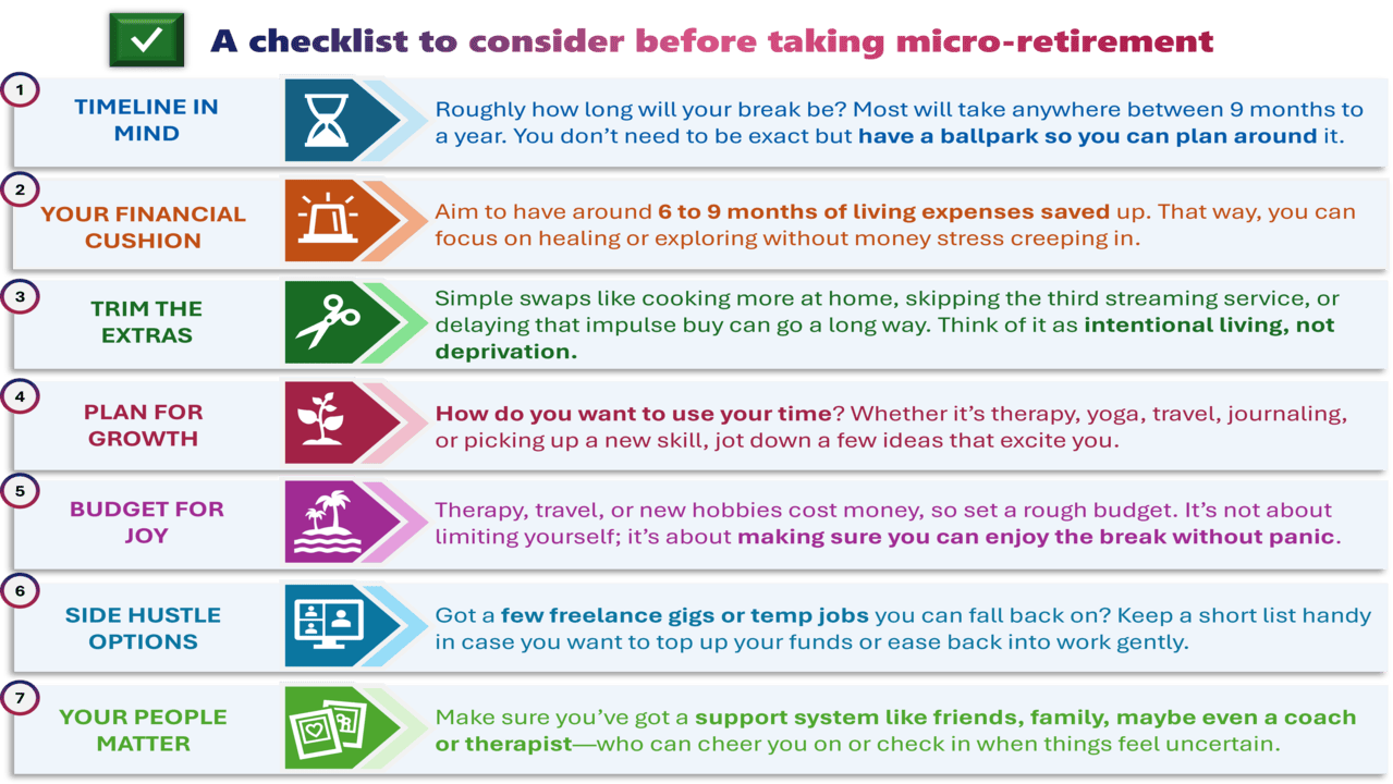 On the upside, micro-retirements can give you room to grow. You might learn a new skill, explore a different industry, or realise what truly matters to you. Taking time off is not always a step back as it can be a pivot towards something more meaningful.