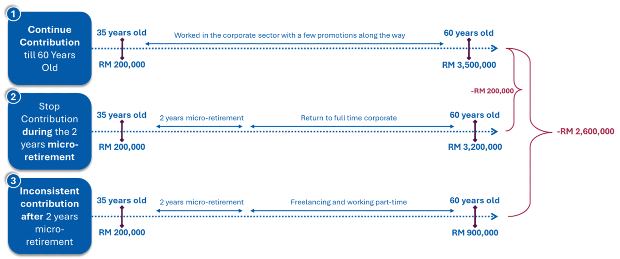 While Amir’s short-term needs may be manageable with lifestyle adjustments, the longer-term financial implications of taking a micro-retirement, particularly ones triggered by burnout, can be more complex. One of the most significant concerns is the potential impact on his retirement savings. Without a stable income, consistent contributions to long-term savings vehicles like the EPF can be disrupted, creating gaps that may be difficult to recover from later.